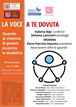 "La voce a te dovuta - quando la violenza di genere incontra la disablità" si è tenuto il 28 Novembre alle 17 alla Casa dell'Aviatore in viale dell'Università 20. Valeria Alpi scrittrice,Simona Lancioni sociologa modera Elena Patrizia Improta presidente Associazione Oltre lo sguardo. Sono intervenuti: Elvira Pintos - Presidente Zonta Club Roma 1; Flavia A.Distefano - Presidente Zonta eClub Roma Parioli;Francesca Loncini-Cons. Capitolina;Giorgio Trabucci-Cons. Capitolino; Francesco del Bello - Pres. II Municipio;Paolo Marchionne - Pres. III Municipio;Maria Tarallo - Pres. Comm. Pari Opportunità;Antonella Faieta-Pres. Telefono Rosa |